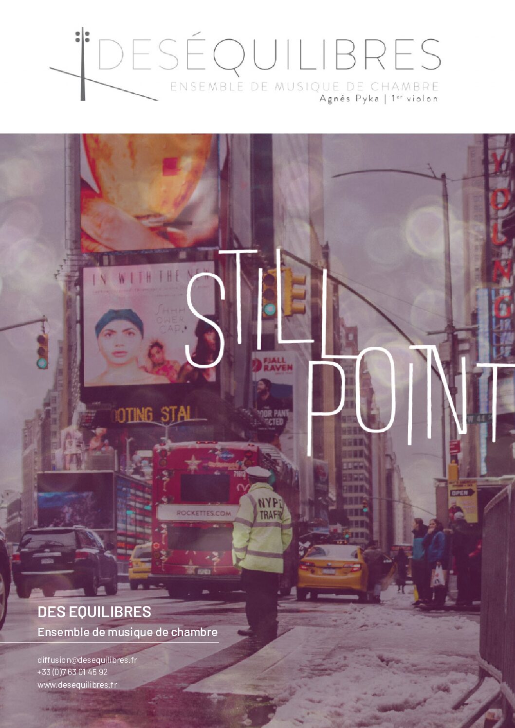 19 décembre 2023, 20h30, Théâtre de Saint-Quentin-en-Yvelines (78) Still Point  PROGRAMME : Ray Lema, compositeur : Still Point, pour quatuor à cordes et piano Aquarius, Valsic Hysteria, Ngandajika, Matongué, Mopti 1, Mopti 2, Partage, Salsa Vanilla, Twist – Smile, Valse Kongo, Babukole. Ensemble Des Equilibres en formation de quatuor à cordes  : Agnès